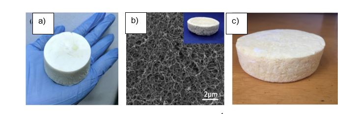 Cellulose là loại polymer sinh học phong phú nhất trên thế giới, là thành phần không thể thiếu trong cấu trúc của thành tế bào thực vật. Phụ phẩm ngành nông nghiệp và công nghiệp chứa hàm lượng cellulose cao đã được nghiên cứu làm nguyên liệu tổng hợp aerogel (Hình 3) với diện tích bề mặt riêng từ 10 đến 975 m2/g, độ rỗng lên đến 99,9% và khối lượng riêng trong khoảng 0,0005 – 0,35 g/cm3 [8, 12, 23]. Tuy nhiên, cellulose aerogel có độ bền nén cơ học lớn hơn so với silica aerogel (5,2 kPa – 16,67 MPa) và tính phân hủy sinh học [8]. Tương tự như silica aerogel truyền thống, vật liệu cellulose aerogel có nhiều ứng dụng như cách nhiệt trong xây dựng [24, 25], chất mang trong dẫn truyền thuốc [26], xử lý dầu tràn, phân tách nhũ tương dầu/nước và hấp phụ thuốc nhuộm trong nước thải [27-29].