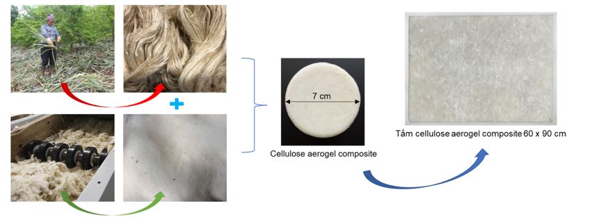 Trước các thực trạng của ngành nông nghiệp khi sản lượng phụ phẩm quá nhiều nhưng chưa được sử dụng triệt để, trong khuôn khổ dự án được tài trợ bởi Quỹ đổi mới sáng tạo Vingroup (VinIF), nhóm nghiên cứu của PGS.TS. Lê Thị Kim Phụng thuộc Trường Đại học Bách khoa – ĐHQG TP.HCM hợp tác với PGS.TS. Dương Minh Hải thuộc Trường Đại học Quốc gia Singapore đã nỗ lực tìm kiếm các giải pháp chuyển đổi xanh nguồn phế phẩm nông nghiệp thành vật liệu aerogel tính năng cao, cụ thể đối với hai đối tượng lá dứa thải và tro trấu. Tận dụng khả năng kéo sợi cellulose từ lá dứa và kết hợp với phụ phẩm cellulose khác là sợi cotton thải từ nhà máy dệt may, vật liệu cellulose aerogel composite đã được phát triển bằng phương pháp phối trộn cơ học, có bổ sung chất kết dính polyvinyl alcohol và sấy thăng hoa (Hình 4). Vật liệu có tính siêu nhẹ với khối lượng riêng và độ rỗng lần lượt là 0,019-0,046 g/cm3 và 96,14 – 98,44%. Cellulose aerogel composite có tính chất cách nhiệt với độ dẫn nhiệt siêu thấp (0,039-0,043 W/m.K) ở 25 °C, có nhiệt độ làm việc lên đến 250-275 °C và mô-đun nén Young đạt 11,33-44,63 kPa [32].