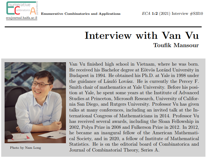 (*) Bản dịch từ bài phỏng vấn GS. Vũ Hà Văn của Toufik Mansour trên Tạp chí Enumerative Combinatorics and Applications (số ECA 1:2 (2021) Interview #S3I10).