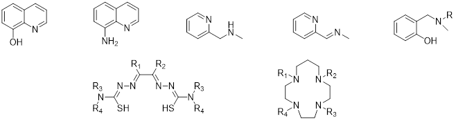 Bên cạnh đó, sự tham gia của các ion kim loại trong cơ chế bệnh sinh của Alzheimer được chứng minh thông qua các liên hệ chặt chẽ giữa bệnh Alzheimer và sự rối loạn điều hòa các ion kim loại. Các mảng amyloid trong não của bệnh nhân Alzheimer tích lũy đồng (Cu), kẽm (Zn) và sắt (Fe) ở mức cao hơn não người bình thường lần lượt là 5,7; 3,1 và 2,8 lần. Do đó, các tác nhân khóa ion kim loại cũng là một trong số các chất có tiềm năng điều trị bệnh Alzheimer. Tuy nhiên, việc thiết kế, phát triển các tác nhân khóa kim loại kháng Alzheimer gặp rất nhiều thách thức do ion kim loại đóng nhiều vai trò quan trọng khác trong cơ thể. Cụ thể, một số yếu tố cần được đảm bảo trong cấu trúc của các tác nhân như: khả năng thấm qua hàng rào máu não, chọn lọc với ion Cu2+ để tránh tương tác với ion sắt và kẽm vốn có trong nhiều enzym quan trọng khác của cơ thể, chọn lọc với các enzym và metalloprotein (dùng để chỉ một protein có sự liên kết/bao bọc ion kim loại) liên quan đến cơ chế gây bệnh Alzheimer. Nhìn chung, các chất khóa ion Cu2+ thường là dẫn chất của các khung hydroxyquinolin, aminoquinolin, tatraazamacrocyles, aminophenol, aminopyridin, bis(thiosemicarbazo-nato), peptid, v.v. (Hình 4).