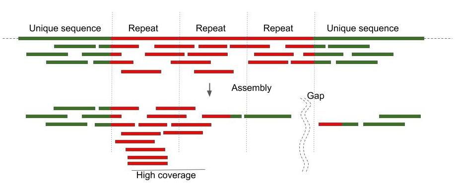 Kĩ thuật giải trình tự đoạn nhỏ xuất hiện như một ví dụ đầu tiên của việc áp dụng thuật toán vào phân tích dữ liệu sinh học. Tuy nhiên, nó cũng có hạn chế nhất định: nếu toàn bộ hệ gen không có đoạn nào lặp lại, thì các phần được cắt nhỏ ra sẽ đều độc nhất, việc lắp ghép sẽ rất dễ dàng. Tuy nhiên hệ gen càng có nhiều đoạn lặp lại, thì việc lắp ghép này sẽ càng khó.