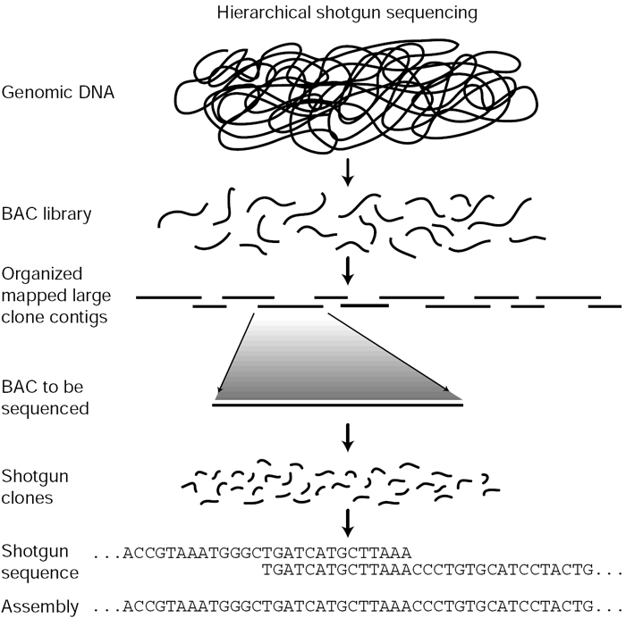 Để giải quyết vấn đề này, một kĩ thuật tên là “giải trình tự đoạn nhỏ theo phân cấp” – hierarchical shotgun sequencing đã ra đời: bộ gen ban đầu sẽ được “cắt” ra thành các phần cỡ trung bình, có thể xác định được vị trí nhờ vào toạ độ đã được fingerprint, sau đó mới cắt nhỏ ra để thực hiện giải trình tự đoạn nhỏ. Thuật toán sẽ lắp ráp các đoạn nhỏ thành các đoạn cỡ trung bình, sau đó mới mở rộng để các đoạn này xếp chồng lên nhau. Lúc này, vấn đề các đoạn lặp sẽ chỉ ảnh hưởng trong nội bộ của các phần cỡ trung bình, chứ không ảnh hưởng đến toàn bộ hệ gen nữa.