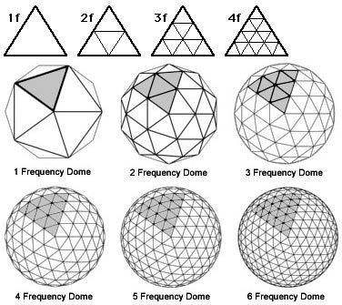3. Fuller đã chỉ ra rằng đó chính là thiết kế, tất cả các công trình kể trên, dù to dù nhỏ, đều có đúng 12 điểm kỳ dị (nếu nó là mặt cầu hoàn chỉnh) vì tất cả đều được xây dựng từ khối nhị thập diện đều 20 mặt. Thật vậy, khi muốn dựng những hình cầu này, các KTS đã bắt đầu từ một hình đa diện gần giống hình cầu nhất, đó là hình nhị thập diện gồm 20 tam giác. Nhưng rõ ràng nó chưa phải hình cầu. Vậy thì ta sẽ chia nhỏ các cạnh ra. Nếu ta chia mỗi cạnh làm đôi thì mỗi tam giác sẽ có 4 tam giác nhỏ, và tưởng tượng ta thổi phồng từ trong ra thì sẽ có hình 80 mặt tam giác nhỏ, nó gần giống hình cầu hơn hình 20 mặt. Cứ như thế, người ta có thể chia 3, chia 4, chia 5… mỗi cạnh, càng chia nhỏ thì hình nhận được càng giống hình cầu. Nhận thấy là tất cả những điểm mới khi ta chia đều dính dưới 6 tam giác. Nhưng vẫn luôn còn đó 12 đỉnh đầu tiên chỉ đỉnh với 5 tam giác. Như vậy dù hình cầu ta to nhỏ cỡ nào, dù có trăm, nghìn, triệu đỉnh thì luôn có đúng 12 đỉnh kỳ dị.