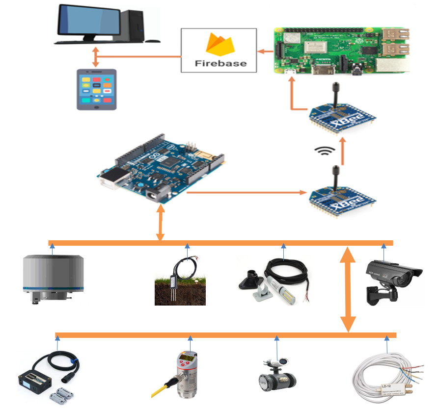 Hình 3 tóm tắt sơ đồ tổng thể phần cứng của dự án. Về phần cứng, hệ thống đề xuất bao gồm các cảm biến (lượng mưa, độ ẩm của không khí và đất, cảm biến lưu lượng bùn, cảm biến dịch chuyển đất, cảm biến áp suất thủy động, cảm biến dây và camera để phát hiện lưu lượng và lũ quét) với bộ vi xử lý tích hợp và mô-đun để truyền dữ liệu không dây Zigbee, bộ xử lý trung tâm trên nền các Chip 64 bit có cài hệ điều hành trên Chip và các ứng dụng để theo dõi dữ liệu trên máy tính và điện thoại thông minh. Các cảm biến thông minh sẽ đọc các thông số quan trọng mọi lúc, sau đó dữ liệu đọc được sẽ được gửi đến bộ xử lý trung tâm bằng phương pháp truyền thông không dây Zigbee, từ hệ thống điều khiển trung tâm, dữ liệu sẽ được lưu trên cơ sở dữ liệu Firebase, sau đó các ứng dụng trên máy tính và điện thoại sẽ được xây dựng trên cơ sở dữ liệu này và các nguồn dữ liệu thu thập khác.