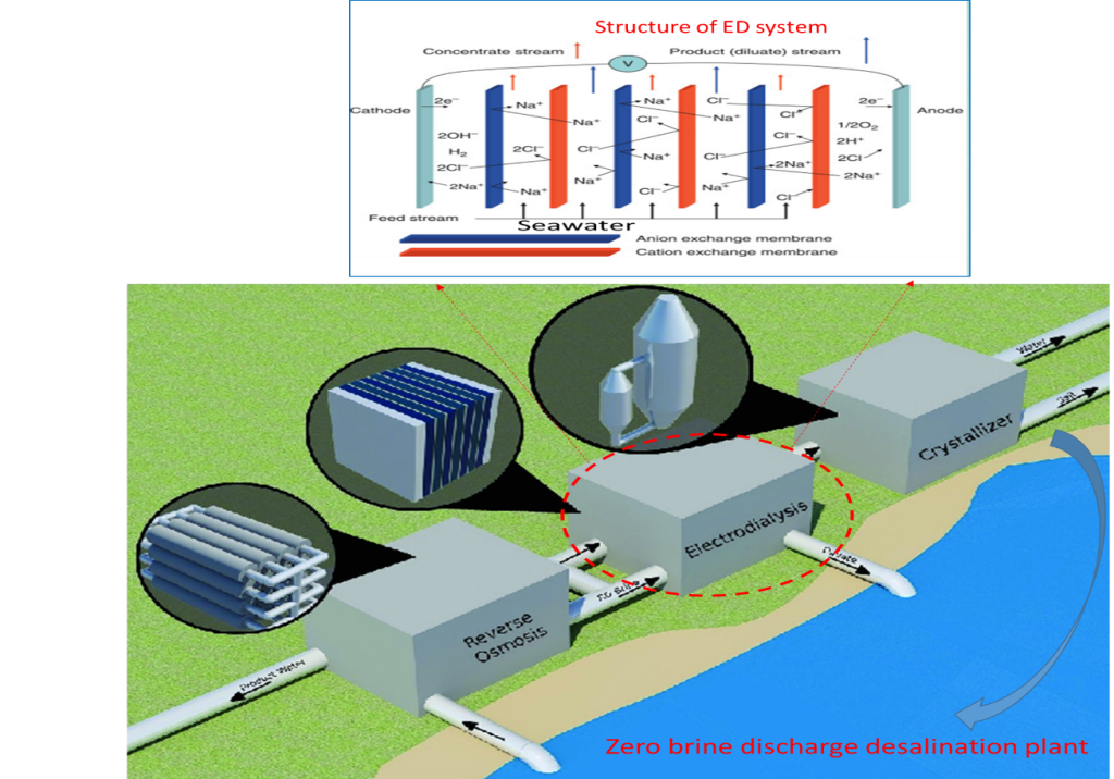 Hình 4. Nhà máy khử mặn thành nước ngọt sử dụng công nghệ kết hợp RO-ED- crystallizer không xả nước muối với các hệ thống phụ RO, ED và thiết bị kết tinh (Hiệu chỉnh từ [11])