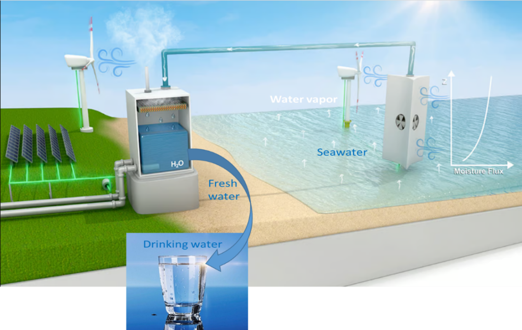 Dựa trên ý tưởng mặt trời làm nóng bề mặt đại dương, gây bay hơi và tạo ra nước ngọt dưới dạng mưa, một nhóm nghiên cứu tại Trường ĐH Illinois của Mỹ đã đề xuất phương pháp khai thác nguồn hơi nước từ đại dương để sản xuất nước ngọt [2]. Nhóm nghiên cứu đã đề xuất xây dựng các cấu trúc ngoài khơi, cách đất liền vài km, thu giữ không khí giàu hơi nước và dẫn về đất liền để ngưng tụ thành nước ngọt, sau đó được sử dụng cho sinh hoạt, nông nghiệp và các nhu cầu khác. Hệ thống SVC hoạt động tương tự vòng tuần hoàn nước tự nhiên, nhưng với sự can thiệp kỹ thuật để điều hướng hơi nước về nơi cần thiết. Năng lượng để vận hành hệ thống có thể đến từ các trang trại gió ngoài khơi và các tấm pin mặt trời trên đất liền, giúp đảm bảo tính bền vững.