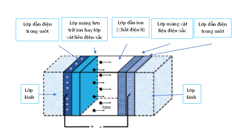 Cấu trúc của một cửa sổ thông minh điện sắc điển hình thường bao gồm một đơn vị kính cách nhiệt hai lớp (IGU: Insulated Glass Unit), một lớp phủ vật liệu điện sắc và một hệ thống điều khiển. Thành phần quan trọng là lớp phủ vật liệu điện sắc (EC: electrochromic) với các lớp (thường là năm lớp) được lắng đọng trên IGU để thực hiện chức năng điện sắc (Hình 3) [5]. Lớp đầu tiên là một chất dẫn electron trong suốt về mặt quang học lắng đọng trên thủy tinh. Vật liệu phổ biến nhất cho lớp dẫn này là oxit thiếc indium (ITO). Lớp thứ hai là vật liệu EC, có thể dẫn đồng thời ion và electron. Lớp thứ ba là chất điện phân chỉ dẫn ion dưới dòng điện chạy ở điện áp thấp (1 – 5 V). Lớp thứ tư là màng đối điện để dẫn điện của cả electron và ion, có chức năng lưu trữ hoặc giải phóng ion cho vật dẫn ở lớp thứ năm và chất điện phân ở lớp thứ ba. Trong một số trường hợp, lớp thứ tư cũng có thể là chất dẫn ion thay thế cho lớp thứ ba. Vật liệu EC cũng có thể được sử dụng cho lớp này, hoạt động như một cách bổ sung cho lớp thứ hai, do đó hoạt động đồng thời cùng với lớp thứ hai để có hiệu suất chuyển màu cao hơn [6]. Cuối cùng, lớp thứ năm, tương tự như lớp thứ nhất, là một chất dẫn electron trong suốt khác để cung cấp điện trường phân bố đồng đều hơn trên bề mặt thủy tinh. Khi cửa sổ thông minh EC hoạt động, một điện áp được đặt vào hai lớp dẫn trong suốt, cho phép các ion đi qua năm lớp do đó đạt được sự thay đổi màu sắc.