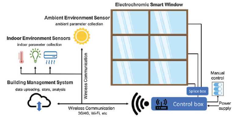Mặt khác, do xu hướng phát triển của các tòa nhà không sử dụng năng lượng ròng (Net Zero Energy Buildings – NZEBs), hay còn gọi là nhà tự cung cấp năng lượng trên toàn thế giới trong những năm gần đây, đã mang đến một cơ hội tuyệt vời khác cho các cửa sổ thông minh điện sắc mang đặc tính tiết kiệm năng lượng [8]. Như trên Hình 4, các cửa sổ thông minh được điều khiển bởi hệ điều khiển thông minh có thể lấy tín hiệu môi trường xung quanh từ các cảm biến (như cường độ sáng, độ ẩm, nhiệt độ…). Hệ điều khiển có thể đồng bộ hoá dữ liệu với hệ thống quản lý năng lượng chung để tối ưu hoá năng lượng tiêu thụ của các toà nhà.