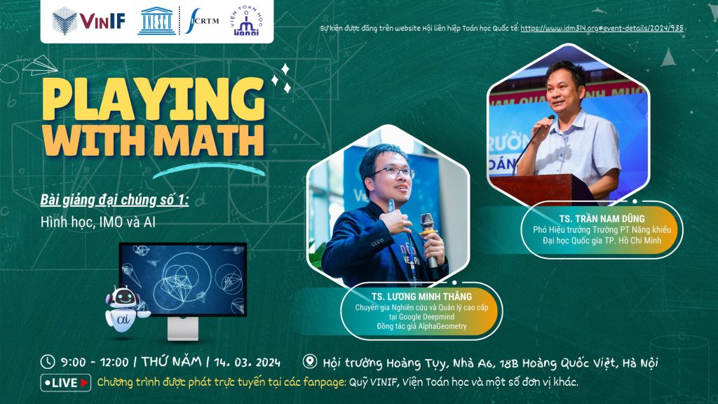 Sáng mai 14.3, Trung tâm Toán học UNESCO (ICRTM), Viện Toán học – VAST và Quỹ đổi mới sáng tạo Vingroup (VINIF) sẽ tổ chức sự kiện Ngày Toán học quốc tế với chủ đề “Playing With Math”. Đây là cơ hội để mọi người cùng thảo luận và đón nhận những kiến thức quý giá về những thành tựu mới nhất trên thế giới.