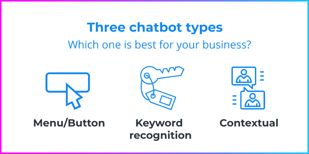 • Menu/Button-based chatbots: Chatbot theo kịch bản. Đây là loại chatbot cơ bản nhất trên thị trường hiện nay. Tương tự như menu trên điện thoại di động, những chatbot này yêu cầu người dùng thực hiện một số lựa chọn để tìm hiểu sâu hơn về câu trả lời cuối cùng. Mặc dù có thể phản hồi 80% truy vấn của khách hàng, menu chatbot gặp trở ngại khi đối diện với các tình huống nâng cao như xuất hiện nhiều biến số hoặc đòi hỏi nhiều tri thức để dự đoán ý tưởng của người dùng.