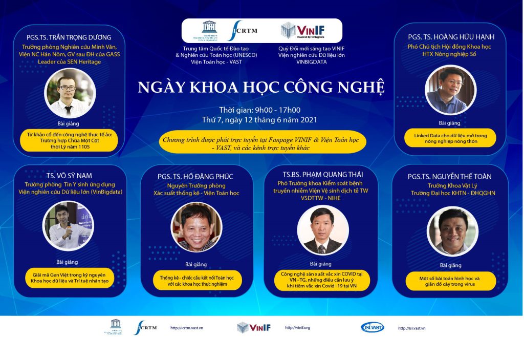 Ngày 12.6, Trung tâm Quốc tế Đào tạo và Nghiên cứu Toán học UNESCO (Viện Toán học – Viện Hàn lâm Khoa học và Công nghệ Việt Nam) và Quỹ Đổi mới sáng tạo Vingroup (VINIF), Viện Nghiên cứu Dữ liệu lớn (VINBIGDATA) sẽ đồng tổ chức chương trình Ngày Khoa học – Công nghệ với chủ đề “Đổi mới sáng tạo để kiến tạo tương lai”. Chương trình sẽ mang tới các góc nhìn chuyên gia xung quanh tiềm năng ứng dụng của khoa học – công nghệ vào nhiều lĩnh vực khác nhau của cuộc sống.
