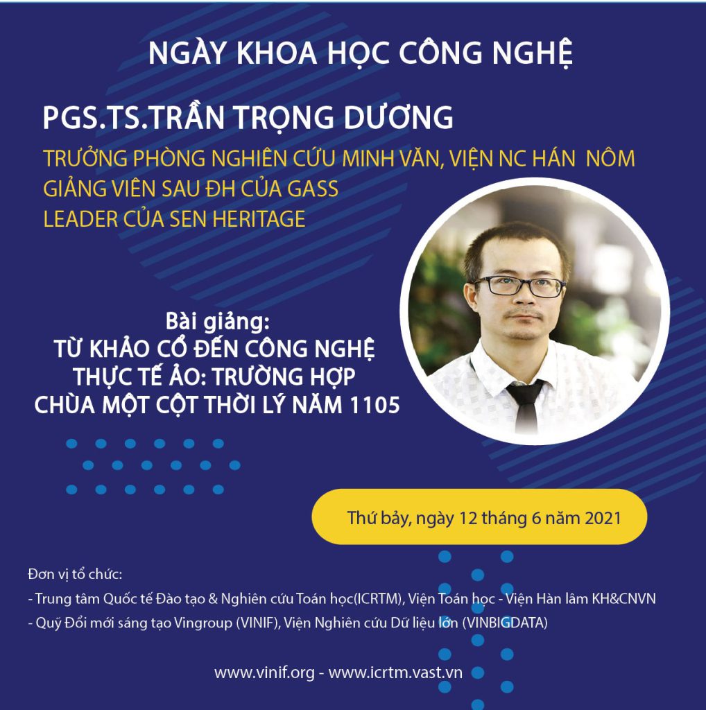 PGS.TS. Trần Trọng Dương sẽ đưa đến cho chúng ta nhiều góc nhìn thú vị dành cho cộng đồng yêu công nghệ và lịch sử. Bài giảng nhắc đến những vấn đề cụ thể trong quá trình nghiên cứu, phỏng dựng kiến trúc một cột chùa Diên Hựu thời Lý. Bắt đầu bằng cứ liệu bi ký năm 1121, đến việc lắp ghép hàng ngàn mảnh vụn khảo cổ học, để đưa ra giả thuyết khoa học. Tiếp đến, bài nói chuyện sẽ trình bày lý thuyết mandala, các thao tác trong nghiên cứu, và phỏng dựng kiến trúc một cột thời Lý bằng công nghệ thực tế ảo.