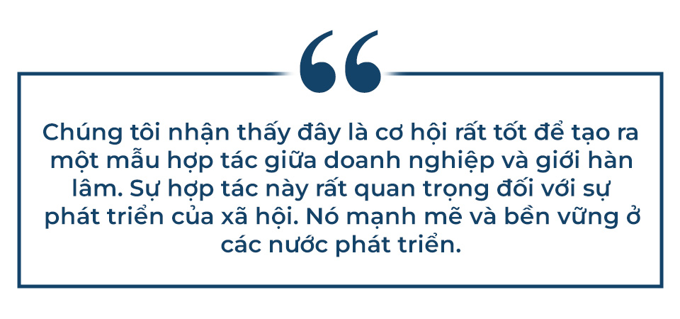 Chúng tôi nhận thấy đây là cơ hội rất tốt để tạo ra một mẫu hợp tác giữa doanh nghiệp và giới hàn lâm. Sự hợp tác này rất quan trọng đối với sự phát triển của xã hội. Nó mạnh mẽ và bền vững ở các nước phát triển. Ở Mỹ, trường đại học lớn nào cũng có rất nhiều phòng thí nghiệm hay ghế giáo sư được tài trợ bởi các nhà hảo tâm, bản thân ghế giáo sư của tôi ở Yale cũng vậy. Nhưng ở Việt Nam, việc các doanh nghiêp tư nhân tài trợ cho nghiên cứu khoa học vẫn chưa được phổ biến. Việc Vingroup, tập đoàn tư nhân lớn nhất Việt Nam đi đầu trong việc này hy vọng sẽ tạo hiệu ứng lan toả trong toàn xã hội.