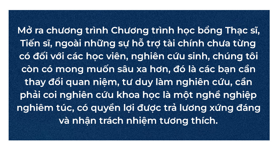Muốn phát triển KHCN từ gốc, phải nâng tầm đội ngũ theo học sau đại học, vì thế trong tháng 03/2019, VINIF mở Chương trình học bổng Thạc sĩ, Tiến sĩ. Mở ra chương trình này, ngoài những sự hỗ trợ tài chính chưa từng có đối với các học viên, nghiên cứu sinh, chúng tôi còn có mong muốn sâu xa hơn, đó là các bạn cần thay đổi quan niệm, tư duy làm nghiên cứu, cần phải coi nghiên cứu khoa học là một nghề nghiệp nghiêm túc, có quyền lợi được trả lương xứng đáng và nhận trách nhiệm tương thích.