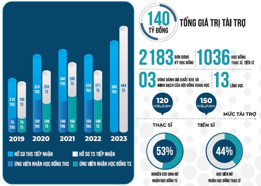 Năm 2021, VINIF triển khai Chương trình học bổng sau Tiến sĩ với mức tài trợ 360 triệu đồng/năm. Đến nay, chúng tôi đã tiếp nhận hơn 600 hồ sơ, trong đó trên 70% là các nhà khoa học trẻ tốt nghiệp tiến sĩ tại nước ngoài. Số lượng học bổng tăng mạnh qua các năm, với tổng kinh phí cho đến nay lên tới gần 65 tỉ đồng.