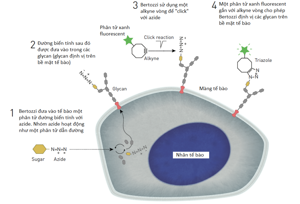 Carolyn Bertozzi cũng bắt đầu các nghiên cứu tương tự trong thời gian đó, và một trong những công trình của bà phải mất tới 4 năm mới có thể tìm hiểu được cách một glycan hoạt động. Carolyn Bertozzi có ý tưởng về hóa học click bắt nguồn từ việc giải quyết các khó khăn này, khi bà nghe một nhà khoa học người Đức giải thích cách sử dụng tế bào để tạo ra một biến thể không có trong tự nhiên là axit sialic, một trong các loại đường cấu thành các glycan. Ý tưởng của Carolyn Bertozzi là sử dụng phương pháp tương tự để tế bào sản sinh axit sialic với một số hóa chất dẫn đường. Nếu tế bào có thể kết hợp axit sialic biến tính trong các glycan khác nhau, từ đó có thể sử dụng hóa chất dẫn đường để lập bản đồ của chúng. Bà đã dùng phân tử fluorescent để làm hóa chất dẫn đường đó và dựa vào ánh sáng phát ra từ phân tử này để định vị các glycan ẩn trong tế bào [1].