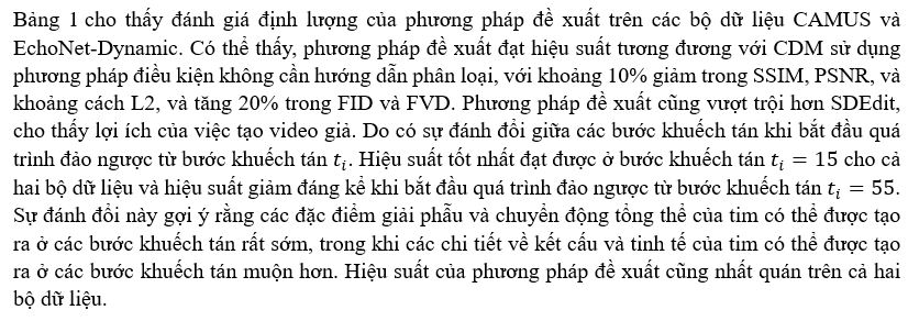 Phương pháp đề xuất là một mô hình khuếch tán video có điều kiện không cần đào tạo (CDM) cho việc tổng hợp siêu âm tim. Phương pháp này có thể tạo ra các hình ảnh siêu âm tim thực tế từ một bản đồ phân vùng cuối kỳ tâm trương duy nhất. Hiệu quả của mô hình trên hai bộ dữ liệu công khai CAMUS và EchoNet-Dynamic cho thấy mô hình đạt hiệu suất tốt về chất lượng hình ảnh cả định lượng và định tính. Thông qua các thí nghiệm, mô hình đề xuất có thể tạo ra các hình ảnh siêu âm tim tốt, đồng nhất theo thời gian và phù hợp về mặt không gian với bản đồ phân vùng đầu vào mà không cần dữ liệu đào tạo bổ sung. Cách tiếp cận này mở ra những khả năng mới cho việc tạo ra các hình ảnh siêu âm tim từ một bản đồ phân vùng duy nhất, có thể được sử dụng cho tăng cường dữ liệu, thích ứng miền và các ứng dụng khác trong lĩnh vực hình ảnh y tế.