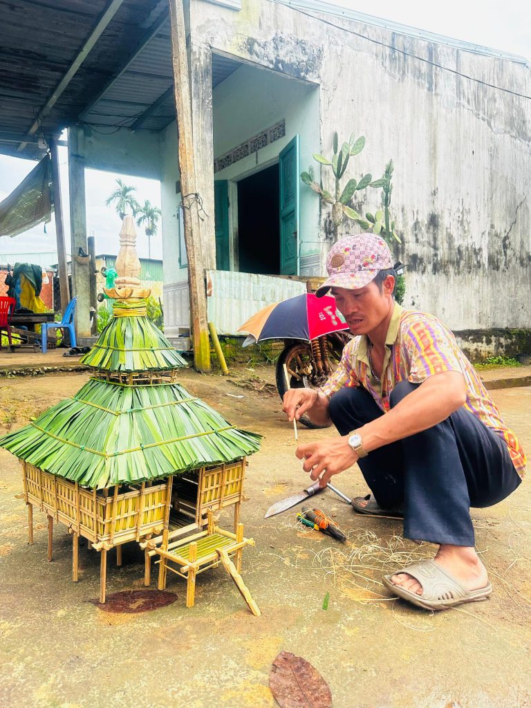 Hình 1. Già làng đang hoàn thiện những chi tiết cuối của mô hình Rông puếch (Nguồn: Đoàn nghiên cứu của Viện Dân tộc học)