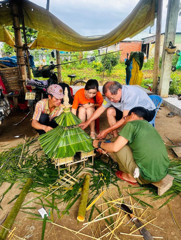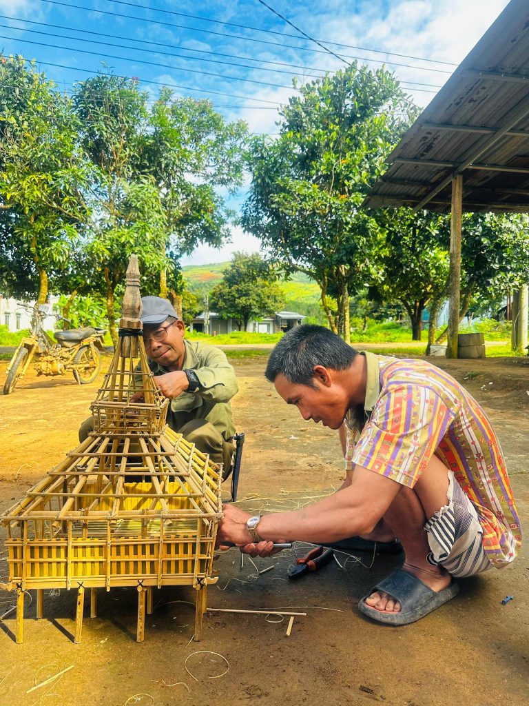 Hình 5. Nhóm nghiên cứu đồng hành cùng nghệ nhân Brâu tái hiện mô hình rông puếch (Nguồn: Đoàn nghiên cứu của Viện Dân tộc học)