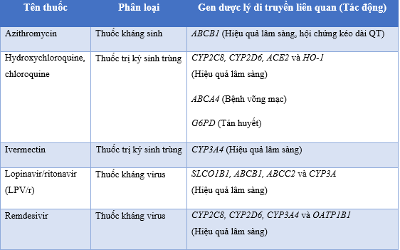 Bảng 1: Thông tin dược lý di truyền của một số thuốc dùng trong điều trị COVID-19 theo hướng dẫn của Viện Y tế Quốc gia Mỹ (NIH). Dữ liệu gene dược lý di truyền được tổng hợp từ Badary et al. Pharmacogenomics (2021).