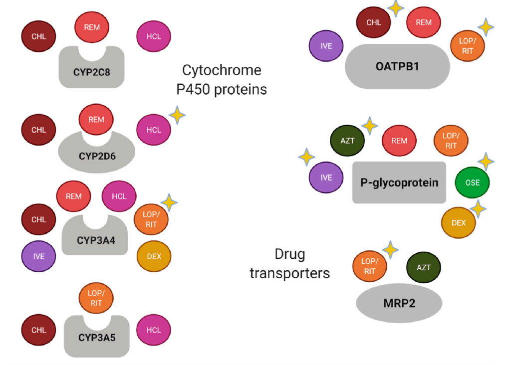 Hình 5: Sơ đồ tương tác giữa các thuốc dùng trong điều trị COVID-19 và enzyme chuyển hóa thuốc (nhóm protein Cytochrome P450) và chất vận chuyển thuốc. OATPB1, P-glycoprotein và MRP2 lần lượt do các gene SLCOB1, ABCB1, và ABCC2 mã hóa. Chú thích: AZT, azithromycin; CHL, chloroquine; DEX, dexamethasone; HCL, hydroxychloroquine; IVE, ivermectin; LOP, lopinavir; OSE, oseltamivir; REM, remdesivir; RIT, ritonavir. Nguồn: Fricke-Galindo et al. Viruses (2021).