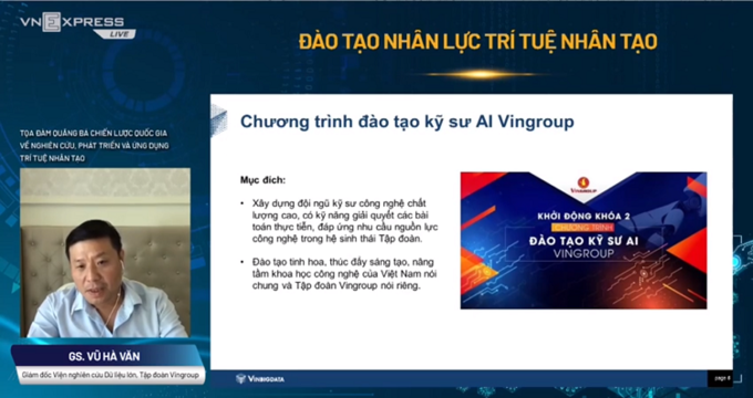 Bắt nguồn từ những bài toán kể trên, Giám đốc Khoa học VinBigdata nhấn mạnh vai trò của doanh nghiệp trong việc phát triển và đào tạo nguồn nhân lực AI, cũng như Khoa học dữ liệu. GS. Vũ Hà Văn lấy ví dụ Chương trình Đào tạo Kỹ sư AI Vingroup là một trong những giải pháp cụ thể mà VinBigdata (thuộc tập đoàn Vingroup) đang triển khai thực hiện. Mục tiêu của chương trình là xây dựng đội ngũ kỹ sư công nghệ chất lượng cao, có kỹ năng giải quyết các bài toán thực tiễn, đáp ứng nhu cầu nguồn lực công nghệ trong hệ sinh thái Tập đoàn nói riêng và là tinh hoa thúc đẩy sáng tạo, nâng tầm khoa học công nghệ của Việt Nam nói chung.